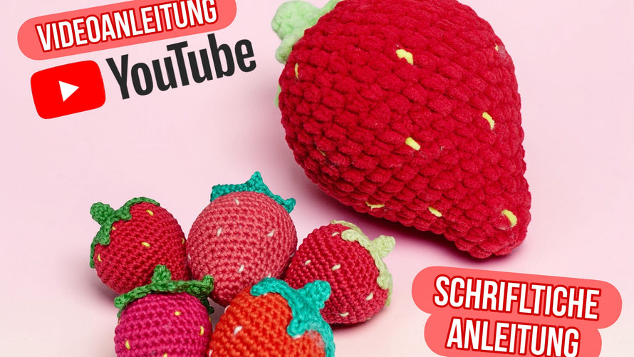 Kostenlose Häkelanleitung zum häkeln von Erdbeeren. die Anleitung gibt es als Video und PDF Häkelanleitung zum herunterladen. Perfekt für Häkelanfänger. -